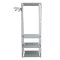 Cadrul metalic oferă stabilitate și durabilitate, în timp ce polițele textile întărite cu plastic sunt perfecte pentru a susține haine, prosoape sau cutii de depozitare. Bratul mobil pentru umerașe îți permite să atârni cămăși, rochii sau sacouri fără a le înghesui.
